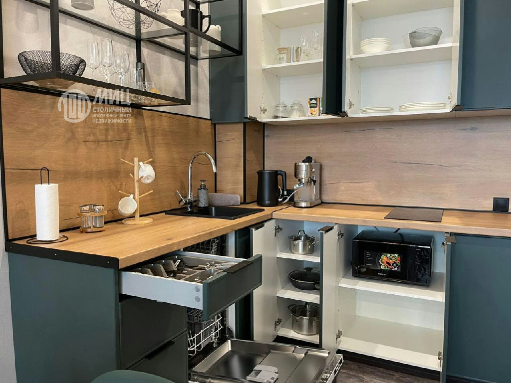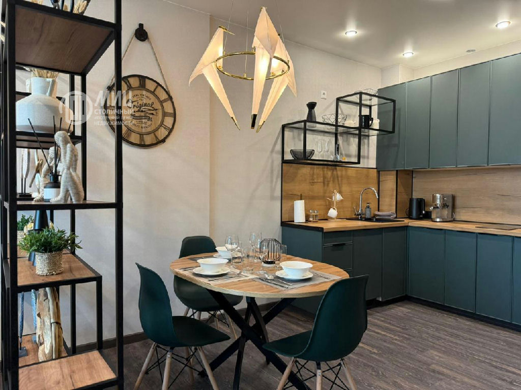 -кухонная зона: большой раздвижной обеденный стол , стулья , кухонный гарнитур, посудомоечная машина, индукционная плита, встроенный холодильник
