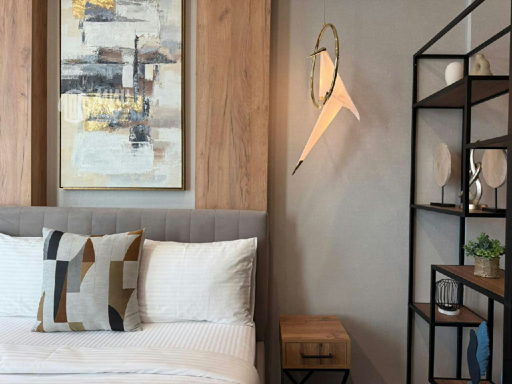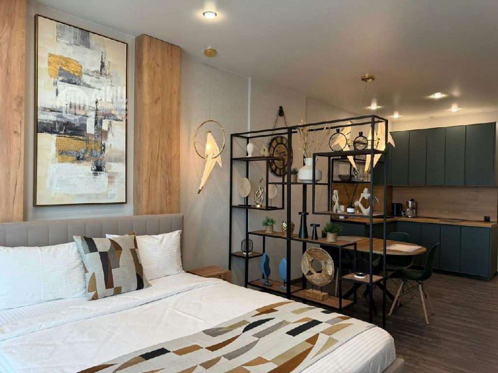 -спальная зона: двуспальная кровать с подъёмным механизмом (доп хранение), комод, прикроватные тумбы, ТВ диагональ 55, сплит система, электрические шторы блэкаут