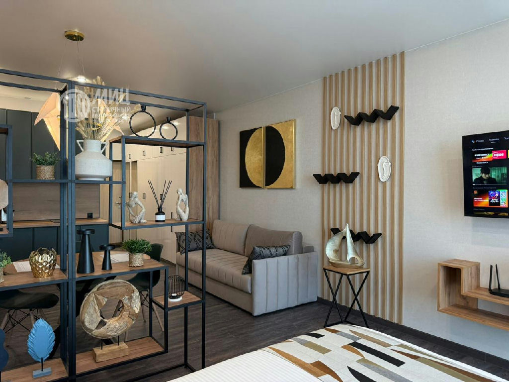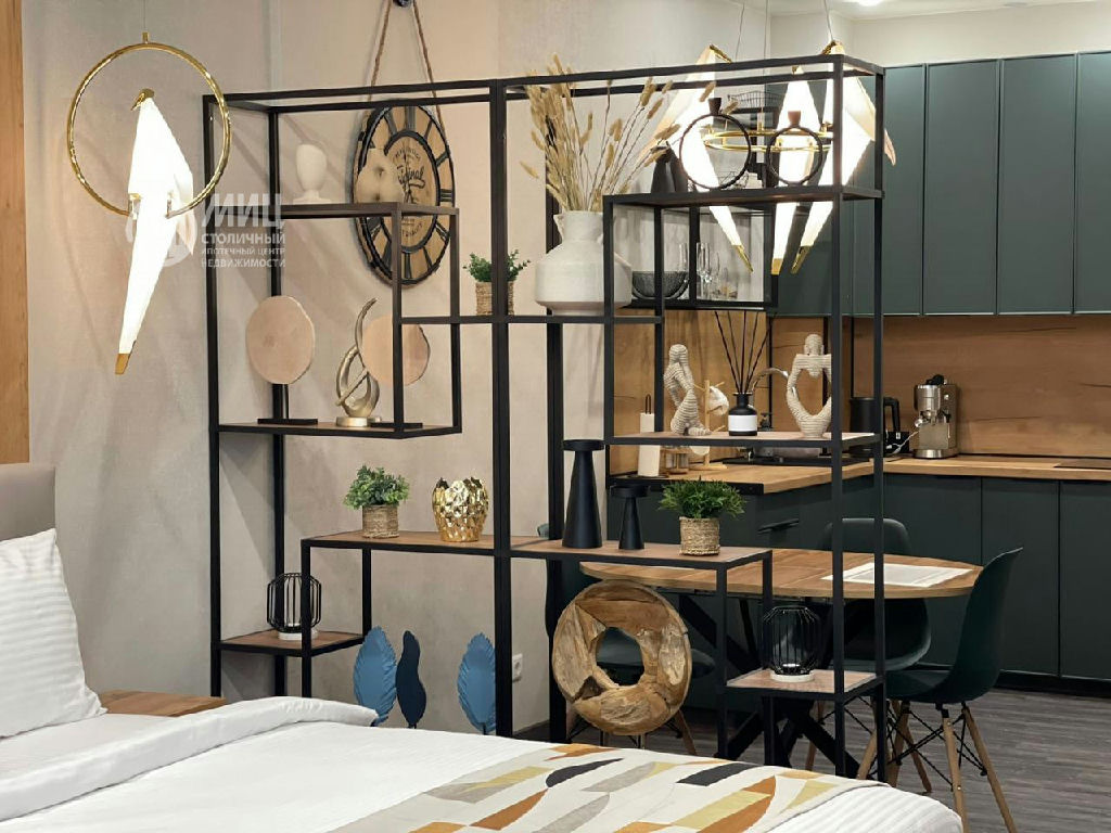 -гостиная зона: раскладной диван, перегородка стеллаж с эксклюзивными предметами интерьера